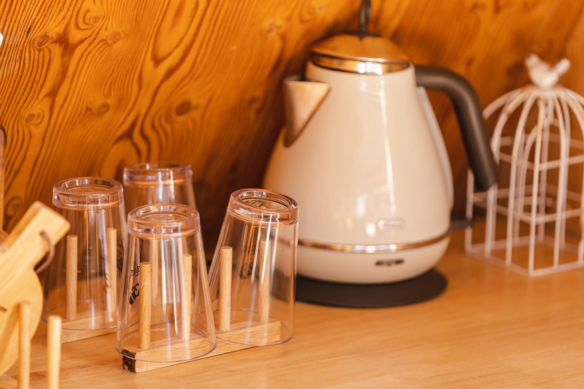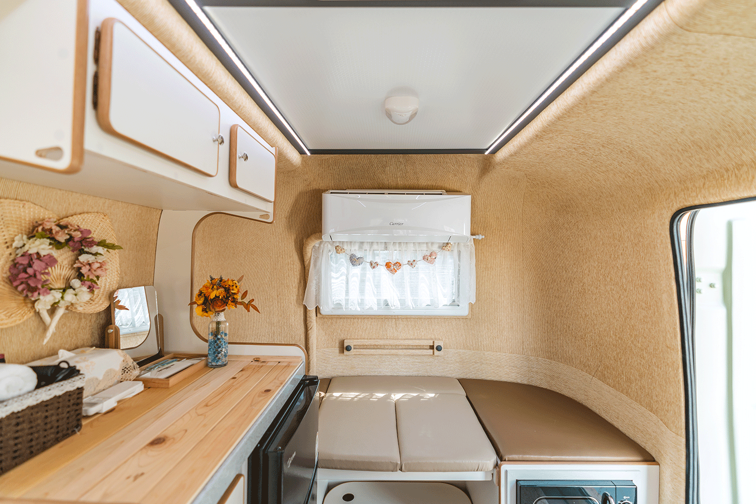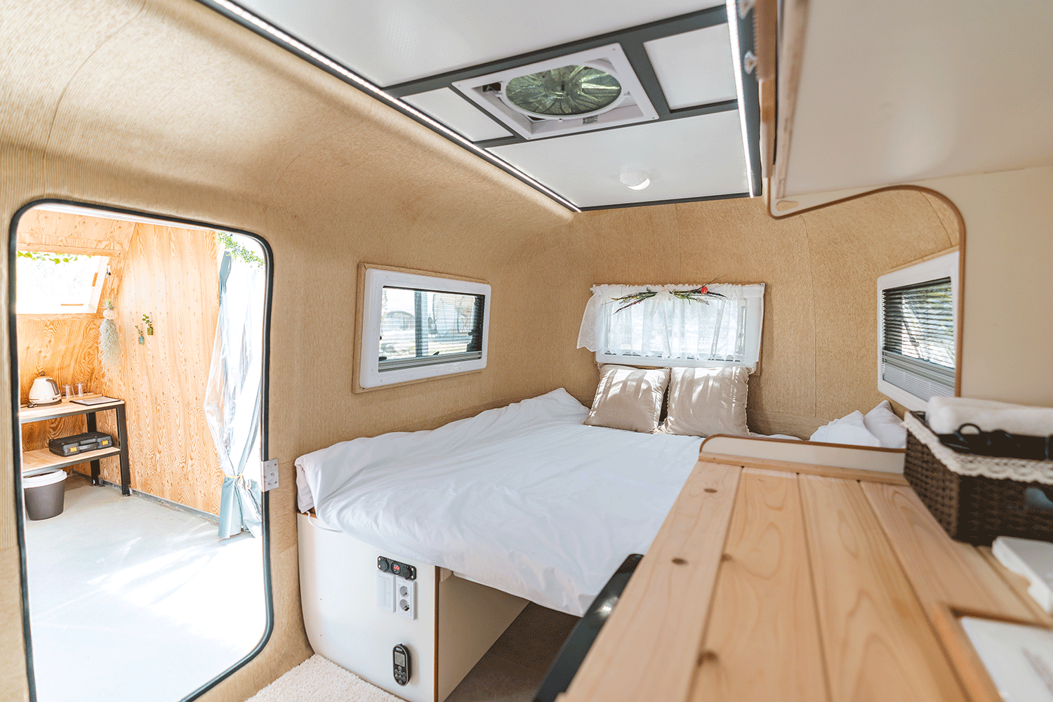우드톤의 인테리어로 따뜻한 카라반 내부를 만나보실 수 있습니다. 침실에는 포근한 호텔식 침구가 준비되어 있습니다. 안락한 침실에서 충분히 쉴 수 있는 시간이 되길 바랍니다.